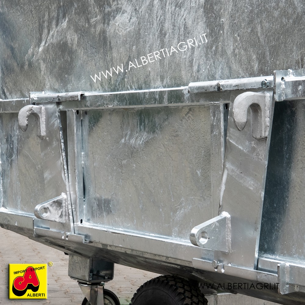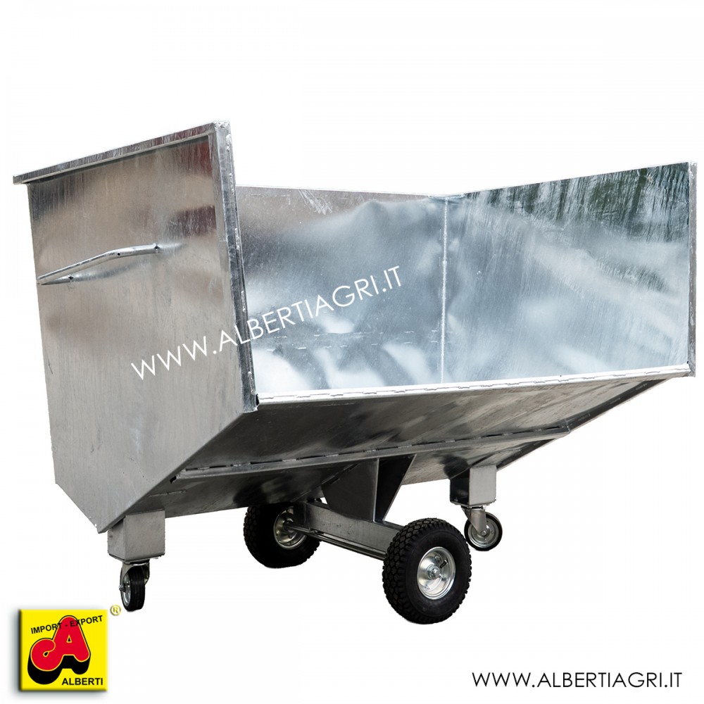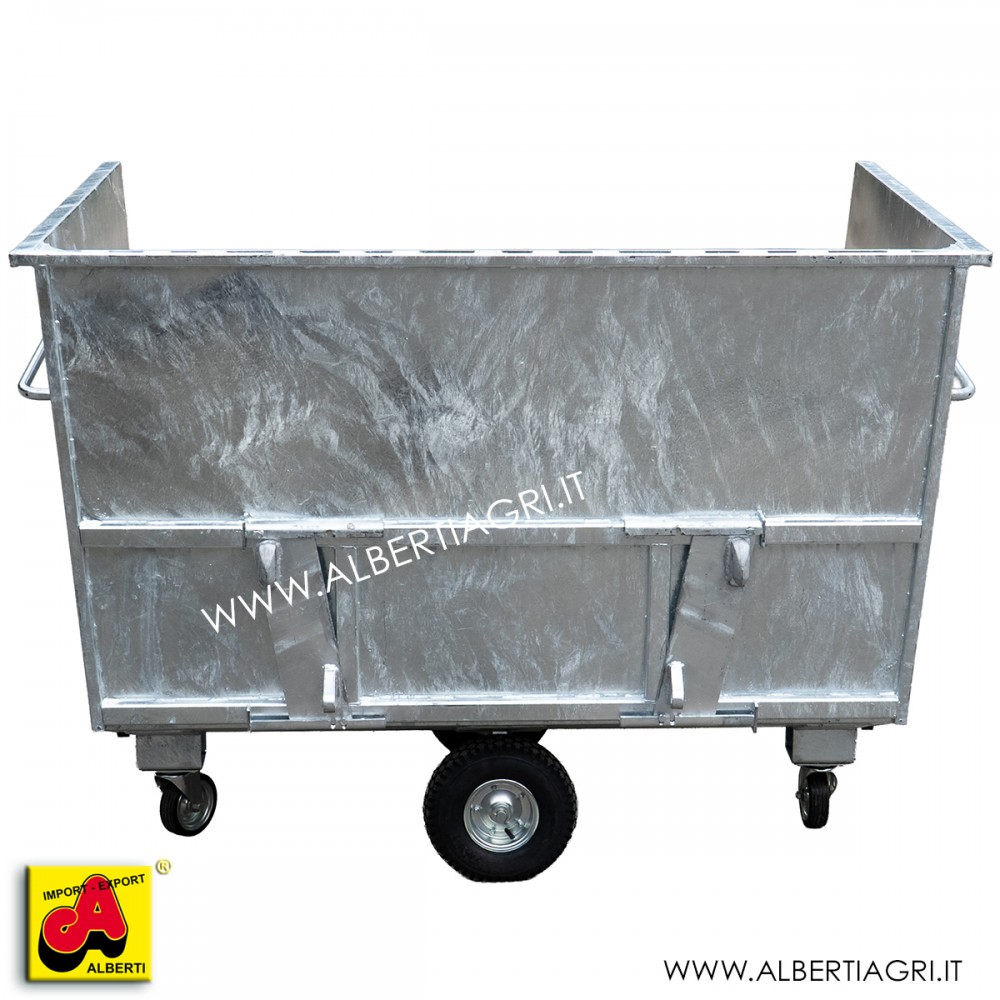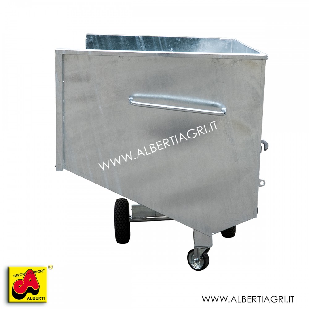 Carrello per grandi quantità di carico, facilmente spostabile con ruote grandi e piccole orientabili. Nella parte posteriore lo si può agganciare a tutti i comunicaricatori frontali standard. Le grosse maniglie aiutano gli oeratori a spostare il carrello in scuderie o aziende. Le 2 ruote grandi fisse e le 2 piccole orientabiliconsentono al carrello di essere spostato con facilità.