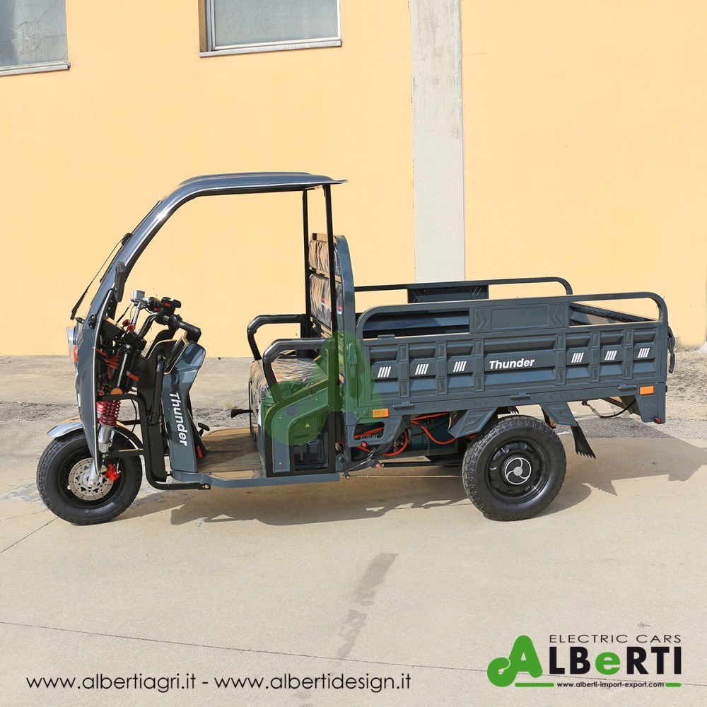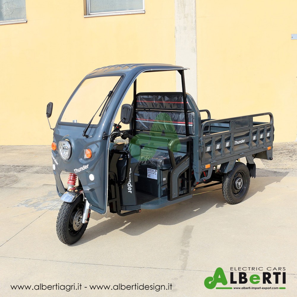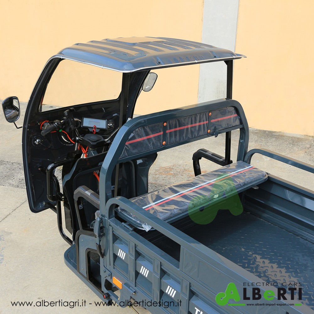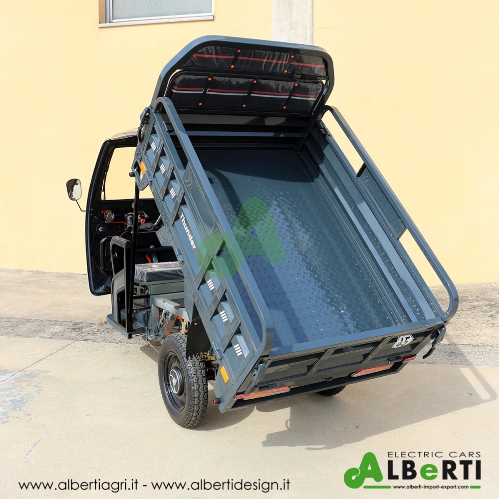 Ciclomotore elettrico ad uso privato e commerciale a tre ruote con una cabina di guida aperta e un cassone capiente ribaltabile. Questo veicolo può essere guidato dai giovani anche solo con il patentino per ciclomotori AM.