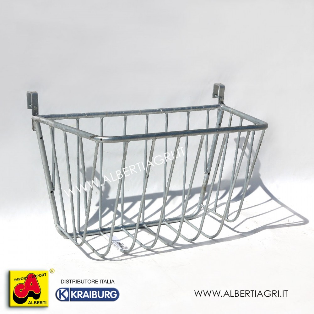 Rastrelliera fieno in acciaio zincato a fuoco da appendere a parete. Indicata per fissaggio a fence con appositi ganci.