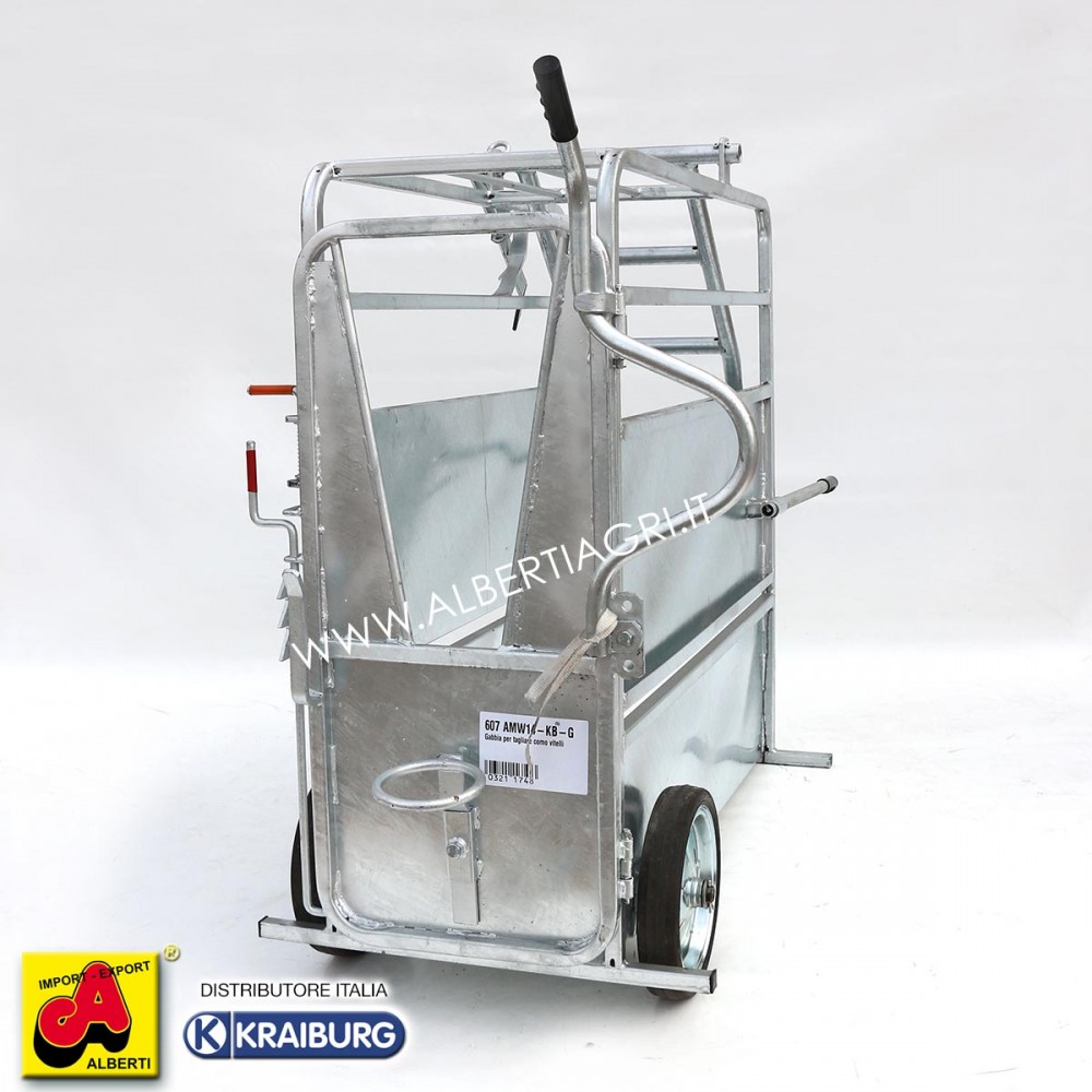Gabbia pert tagliare corna ai vitelli in sicurezza, dotata di ruote e manici.